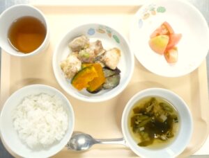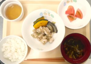 今日はソテーした鶏肉をねぎとごま油の風味を生かした香味ソースであえて、茄子やかぼちゃ、トマトといった夏野菜を添えました。夏らしいメニューとなりました。