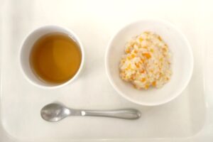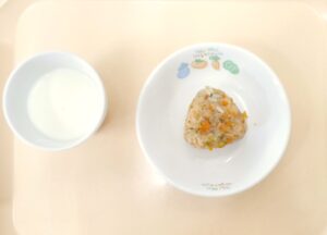 離乳食(後期)午後おやつ:人参ごはん(おかゆ)、麦茶