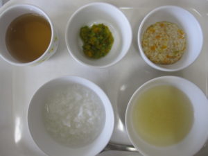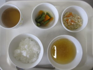 離乳食(中期)午前食:おかゆ、鶏肉と野菜のそぼろ煮、おひたし、スープ、麦茶