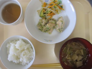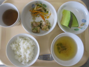 昼食:ご飯、鶏肉の香味ソース、もやしの胡麻酢和え、すまし汁(玉ねぎ、えのき、さやいんげん)、メロン(乳児のみ)、麦茶