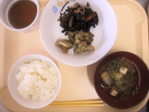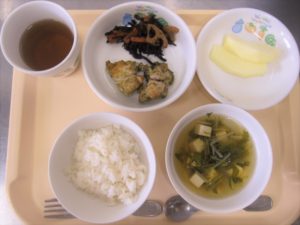 昼食:ごはん、鶏肉の香味焼き、ひじき煮、すまし汁(豆腐、玉ねぎ、水菜)、りんご(乳児のみ)、麦茶