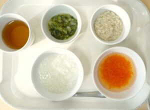 離乳食(中期)午前食:おかゆ、鶏つくね煮、じゃが芋と小松菜のおひたし、スープ