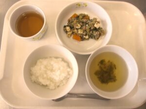 離乳食(後期)昼食:軟飯、なすのそぼろ煮、スープ、麦茶