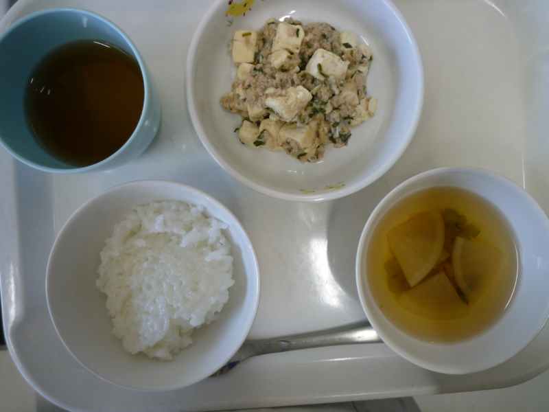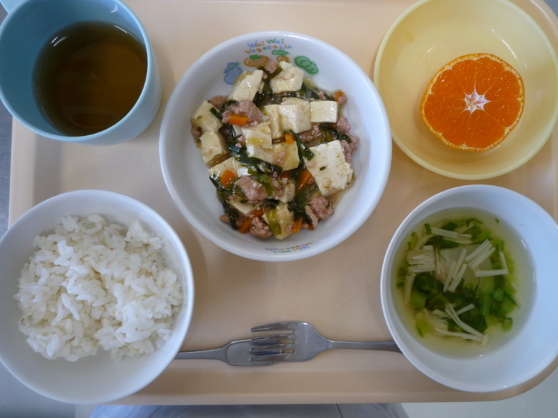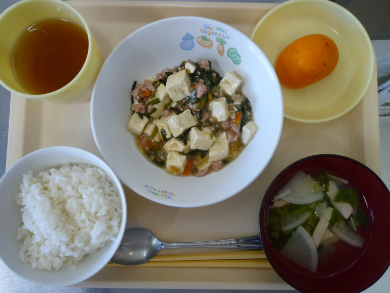 昼食:ご飯、麻婆豆腐、かぶのスープ(かぶ、かぶの葉、ハム、えのき)、みかん、麦茶