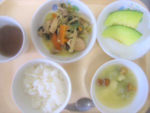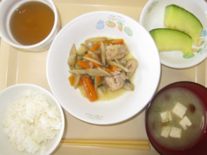 昼食:ごはん、鶏肉の酢醬油煮、みそ汁(豆腐、なめこ、長ねぎ)、メロン、麦茶