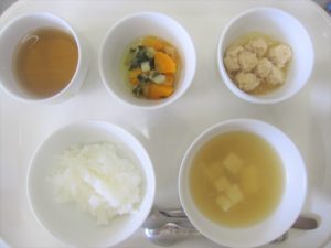 離乳食(後期)昼食:おかゆ、鶏団子煮、おひたし、みそ汁