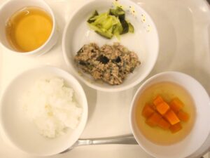 離乳食(後期)昼食:軟飯、なすのそぼろ煮、アスパラのおひたし、スープ