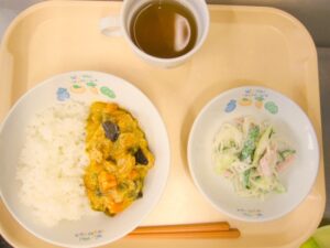 昼食:ごはん、なすカレー、アスパラ春雨サラダ