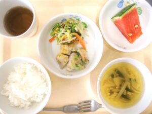 昼食:ご飯、鶏肉の香味ソース、キャベツとハムのサラダ、すまし汁、すいか(乳児のみ)、麦茶