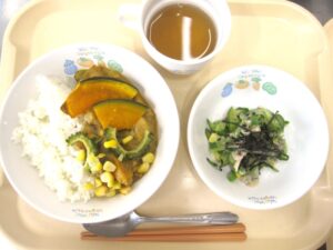 今日のカレーは、かぼちゃ、トマト、なす、ゴーヤなど夏が旬の野菜をたっぷり使った季節の味わいを彩りよく盛り付けました。