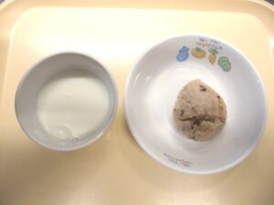 午後おやつ:牛乳、あずき蒸しパン