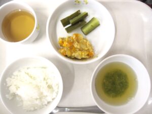 離乳食(後期)昼食:軟飯、かぼちゃの豆乳そぼろ煮、スティックきゅうり、スープ、麦茶
