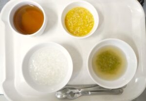離乳食中期 午前食:お粥、かぼちゃのそぼろ煮、オクラのスープ、麦茶