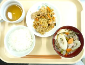 昼食:ごはん、きりたんぽ鍋、切干大根の炒め煮、麦茶、
