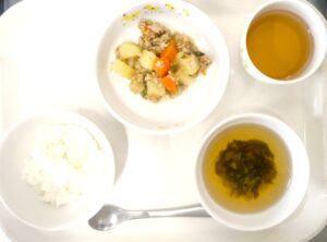 離乳食後期の昼食:おかゆまたは軟飯、じゃがいもと野菜のそぼろ煮、すまし汁(長ねぎ、わかめ)、麦茶
