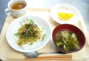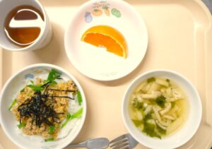 昼食:そぼろ丼、和風スープ、オレンジ、麦茶