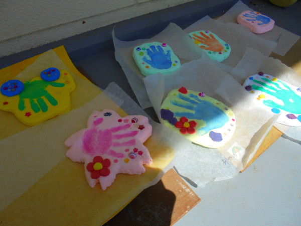 紙粘土の上に手形をし、ビーズなどで飾り付けをしてカラフルで可愛いく仕上げていただきました。1年の思い出になりますように・・・!!