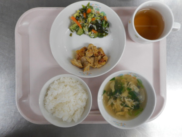 ごはん、青菜とコーンのスープ、タンドリーチキン、