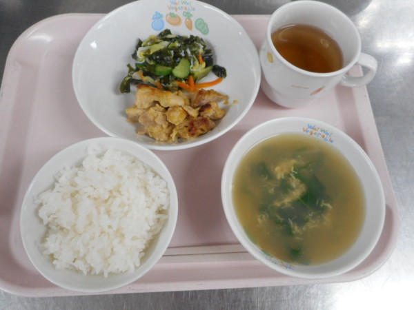 ごはん、青菜とコーンのスープ、タンドリーチキン、わかめサラダ・・・347kcal