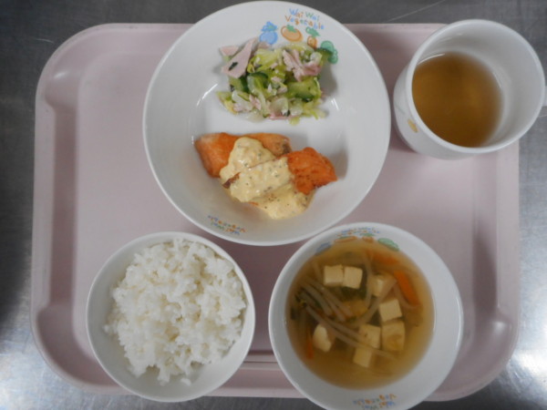 ごはん、豆腐と野菜のスープ、魚のムニエルタルタルソース、グリーンサラダ・・・451kcal