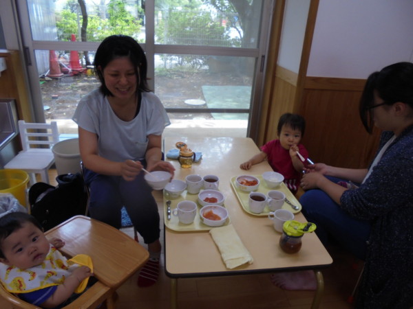 給食試食会では2組の方が利用してくださいました。今日のメニューはパン、スープ、ラザニア、茹で野菜(小さいお友だちは、野菜スープ、豚ひき肉と野菜のトマト煮です)!!園児が誕生会だったので、今日のメニューは誕生会バージョンになっています。