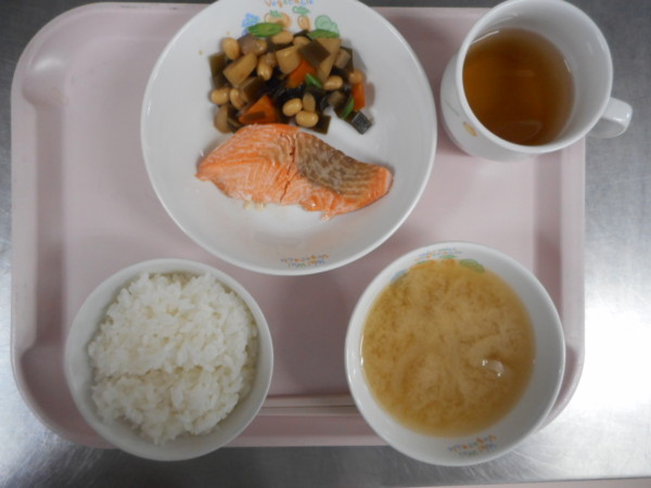 ごはん、味噌汁、焼き魚、五目煮豆・・・348kcal