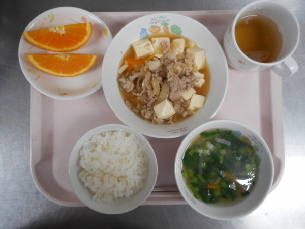 ごはん、味噌汁、肉豆腐、オレンジ・・・384kcal