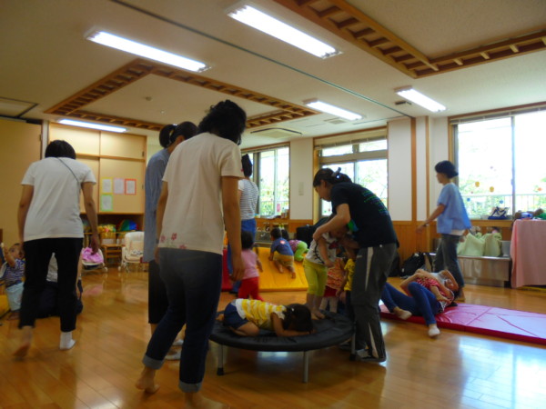 身体の色々な動きを取り入れた体操や、フラフープを並べてピョンっとジャンプなどをする体操、トランポリンやマットの滑り台などの運動遊びをしました♪色々な体操に保護者の方もお子さんたちも笑顔で楽しまれていましたよ!