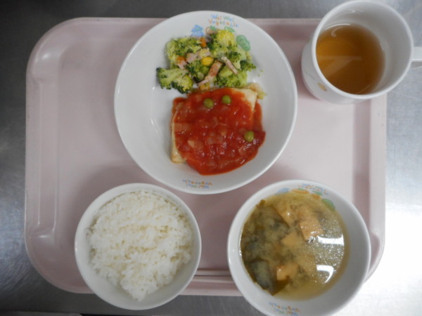 ごはん、味噌汁、魚のムニエルトマトソース、ブロッコリー炒め・・・387kcal