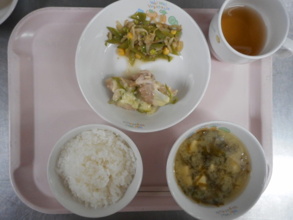 ごはん、味噌汁、鶏のチーズ焼き、スナックえんどうのナムル風炒め・・・367kcal