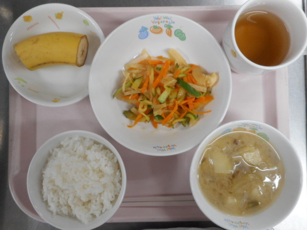 ごはん、味噌汁、魚のマリネ、バナナ・・・395kcal