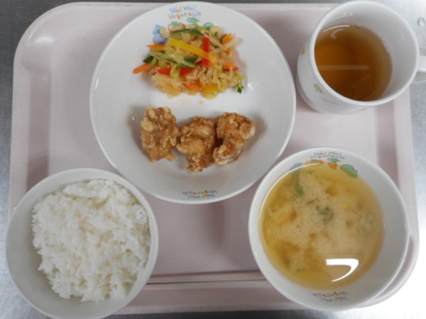 ごはん、味噌汁、鶏の唐揚げ、切り干し大根の中華風サラダ・・・413kcal