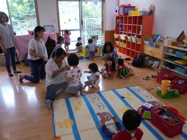 今日はすいか割りがあり、沢山の地域のお友だちに遊びに来ていただきました!2階ホールでおままごとやミニカーなどの玩具で遊んだ後は、すいか割り大会の始まり始まり~!