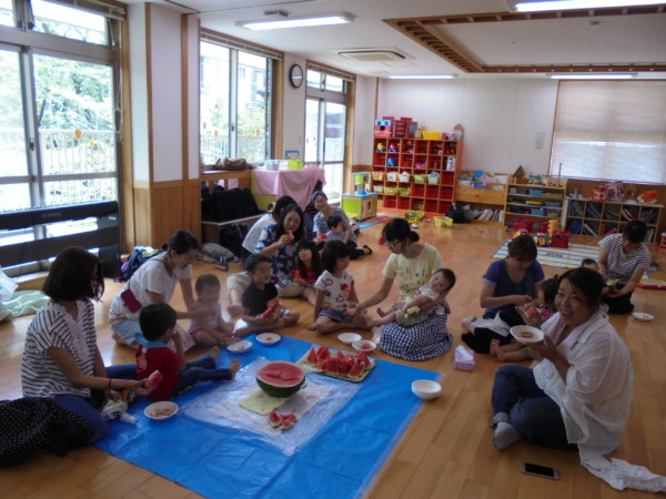 すいかの登場に目を輝かせるママたち・子どもたち!ママと一緒に棒を持ってポンっと叩いてみるお友だちや、1人で棒を持ってチャレンジしてみるお友だちがいたりと、とても楽しい時間となりました☆甘いすいかにみなさんニコニコでしたよ。来年もぜひご参加くださいね。