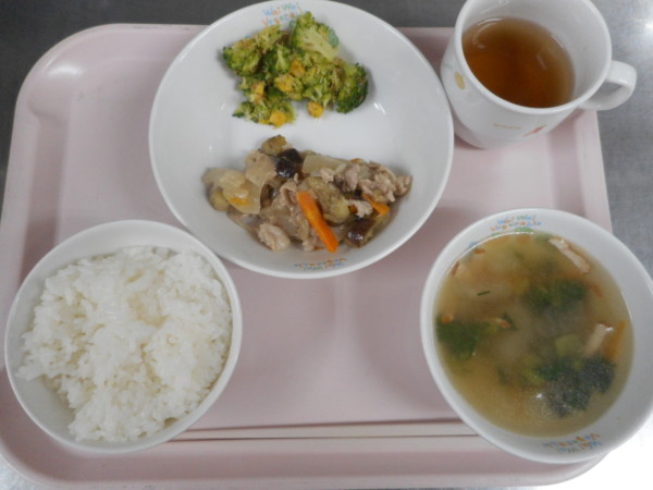 ごはん、冬瓜のスープ、なすと豚肉のみそ炒め、ブロッコリー和え・・・406kcal