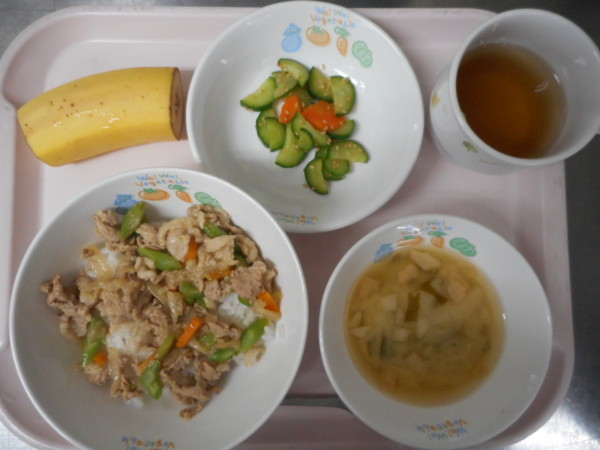 豚丼、味噌汁、きゅうりもみ、バナナ・・・403kcal
