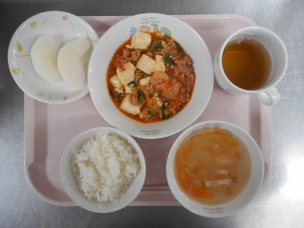 ごはん、春雨スープ、豆腐とエビのケチャップ煮、梨・・・428kcal