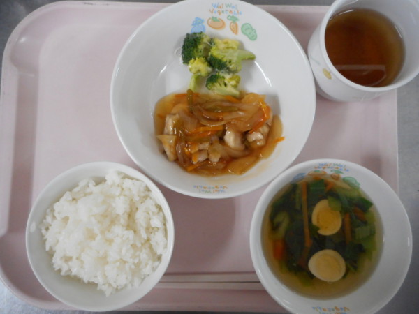 ごはん、月見汁、鶏の甘酢あんかけ、ブロッコリーのチーズ焼き・・・321kcal
