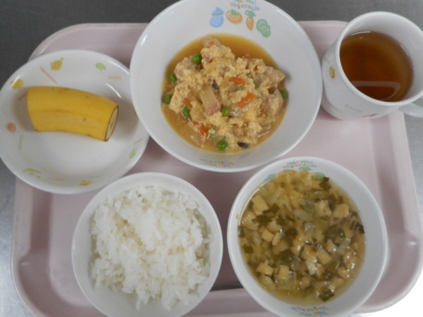 ごはん、味噌汁、親子煮、バナナ・・・411kcal