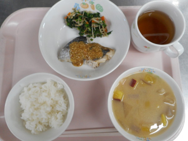 ごはん、さつま汁、魚のごま味噌だれ、おかか和え・・・401kcal
