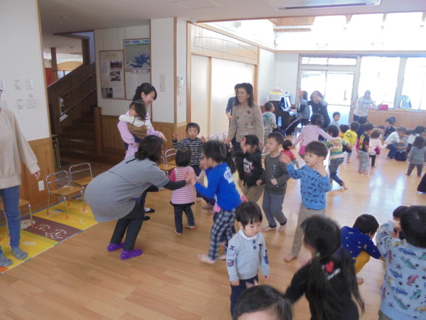 今日はリズムがあり、たくさんのお友だちが参加してくれました。保育園のお友だちが手を繋いでくれると、ニッコリ顔で手を繋ぐ姿が見られ、見ていてとっても微笑ましかったです。地域のお友だちやお母さん方も、リズムの曲を覚え、大きな声で歌ってくれるので、一体感も深まっているようでとっても楽しく過ごすことができました♪またご参加下さいね☆