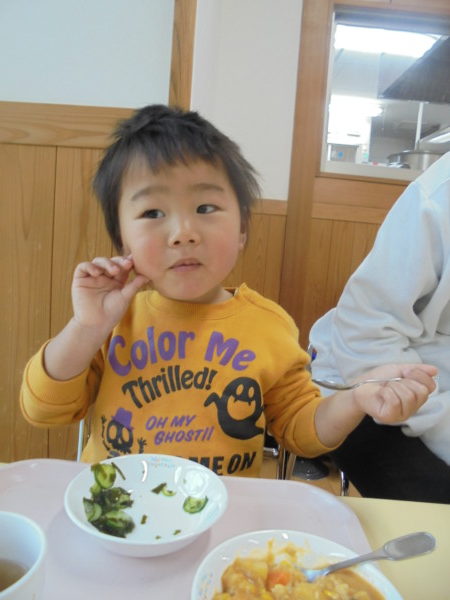 そして、今日は給食試食会がありました。2歳児1名のお友だちが参加してくれました。メニューはカレーです。ニコニコ笑顔でモリモリ食べていましたよ!0歳児のお友だちは来週の試食会に参加してくださいます。
