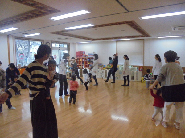 今日は親子体操です。雨が降ったり止んだりのお天気でしたが、たくさんのお友だちが参加してくれましたよ!お母さんと一緒に輪になって身体を動かしたり、向かい合いボールを転がしてキャッチしたりと全身を使って楽しんでいました!最後はサーキットをしました。トンネルでは進むのがちょっぴり怖いお友だちやトンネルの中で一休みするお友だちなどいろいろな姿があり、とても可愛らしかったですよ!親子体操が終わった後は、好きなおもちゃで遊びゆったりと過ごしました。
