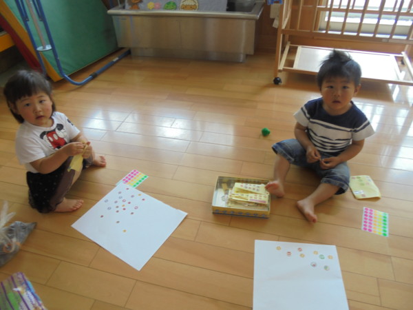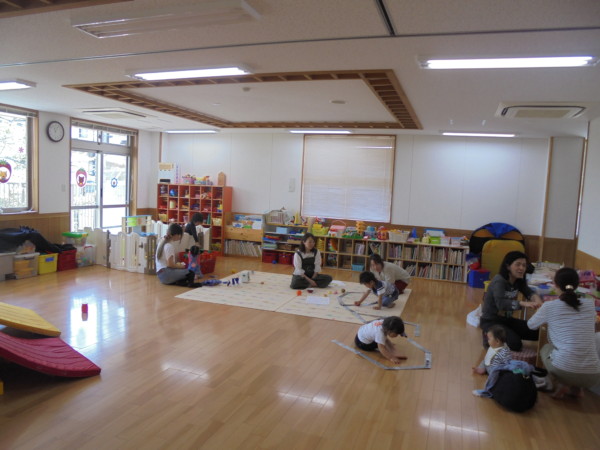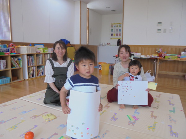 ポカポカ陽気で気持ちの良い一日ですね!今日は木曜園舎開放です。はじめ二組のお友だちが遊びに来て、シール貼りをしまったり過ごしました。その後、お友だちも増え、好きなおもちゃやすべり台などで遊びました。