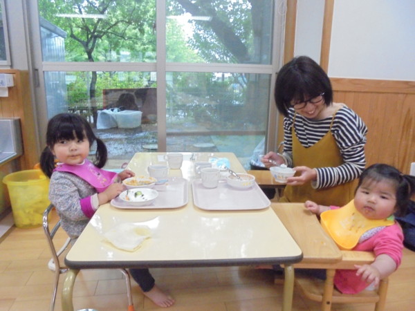 木曜日は園舎開放の日です。地域の方が遊びに来てくれました。好きなおもちゃで楽しそうに遊んでいましたよ。その後、給食試食会がありました。パクパクたくさん食べていました。
