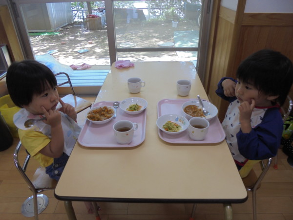 そして2組の方が給食試食会を申し込んでくださいました。今回のメニューは園児にも人気のカレーです。お互いに顔を見合わせてニコニコ食べているお子さまたちの笑顔が可愛かったですよ!給食試食会は申し込み制なので、お気軽に問い合わせてくださいね。