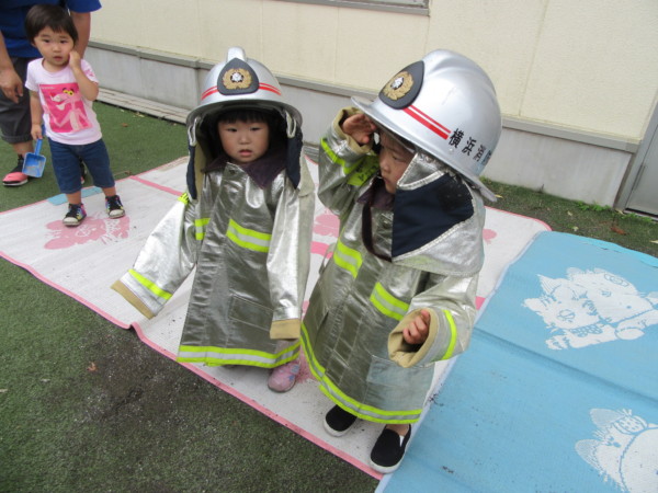 今日は消防署の防災訓練がありました。消防服を着用して写真を撮ったり、煙の中をお家の方と通る煙体験をしたりしましたよ。そして、お家の方には消防士さんから火事や、地震の際の避難の仕方を教えて頂きました。みんなの大好きな消防車も近くで見る事が出来て大喜びのお友だちでした。これを機会にお家の中の家具転倒防止の確認や備蓄品の確認など行ってみてはいかがでしょか?