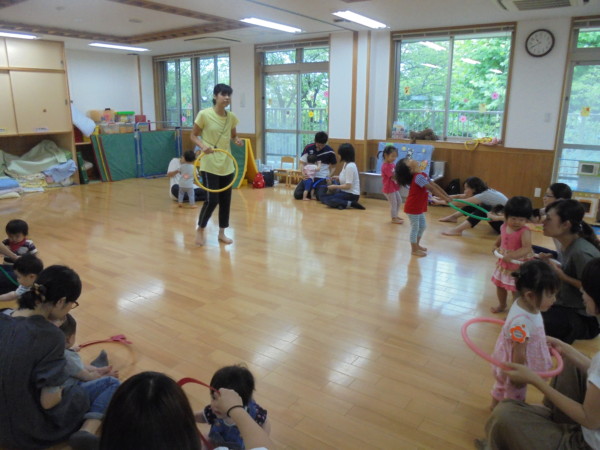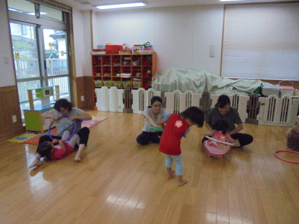 他にも、声や歌に合わせてお子さまの体に触れながら楽しむ体操や、フラフープを使った運動遊びなど、たくさんの運動遊びを体験しました。終わる頃には体も心もほぐれてニコニコ笑顔が素敵でしたよ!