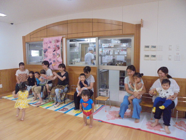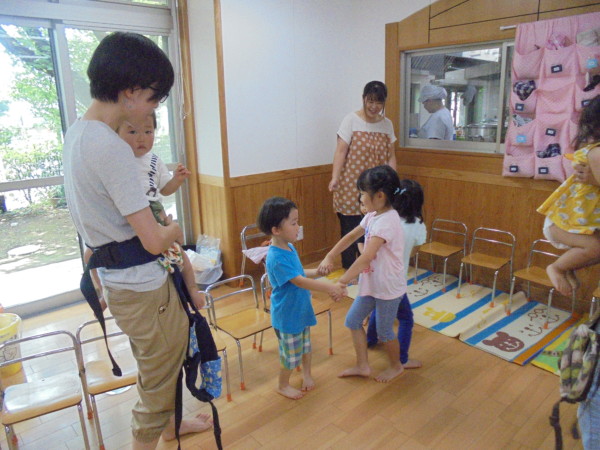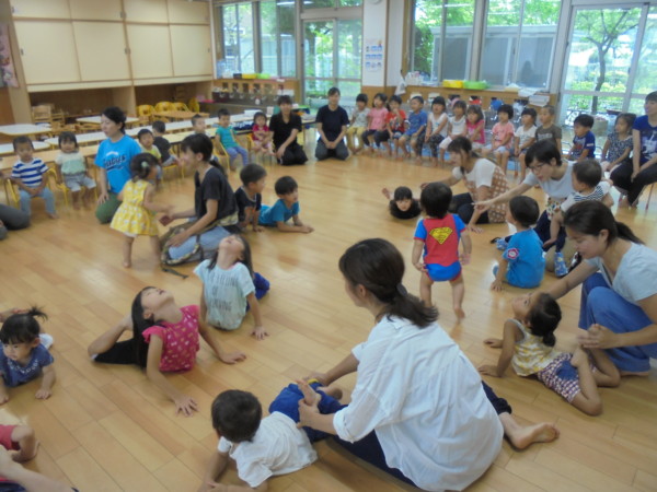 今日はとても暑い一日でしたね。阿久和保育園ではリズム遊びが行われ沢山のお友だちが参加してくれました。最初は緊張気味のお友だちもピアノの音が鳴るとお兄さん、お姉さん達の真似をして一生懸命に体を動か姿がとても可愛かったですよ。明日もプール開放があります、是非遊びに来て下さいね。