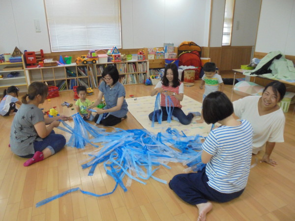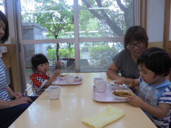 今日はあいにくのお天気でプールはお休みでしたが、ホールに沢山のお友だちが遊びに来てくれました!お気に入りの玩具でお友だちと一緒に楽しそうに遊んでいましたよ。また、お母さんたちに夏祭りの準備のお手伝いをして頂きました。ご協力ありがとうございました。園舎開放後は給食試食会もありました。野菜たくさんのカレーを美味しそうに食べていましたよ。とても美味しい給食なので、ぜひ試食会にも参加してみて下さいね。
